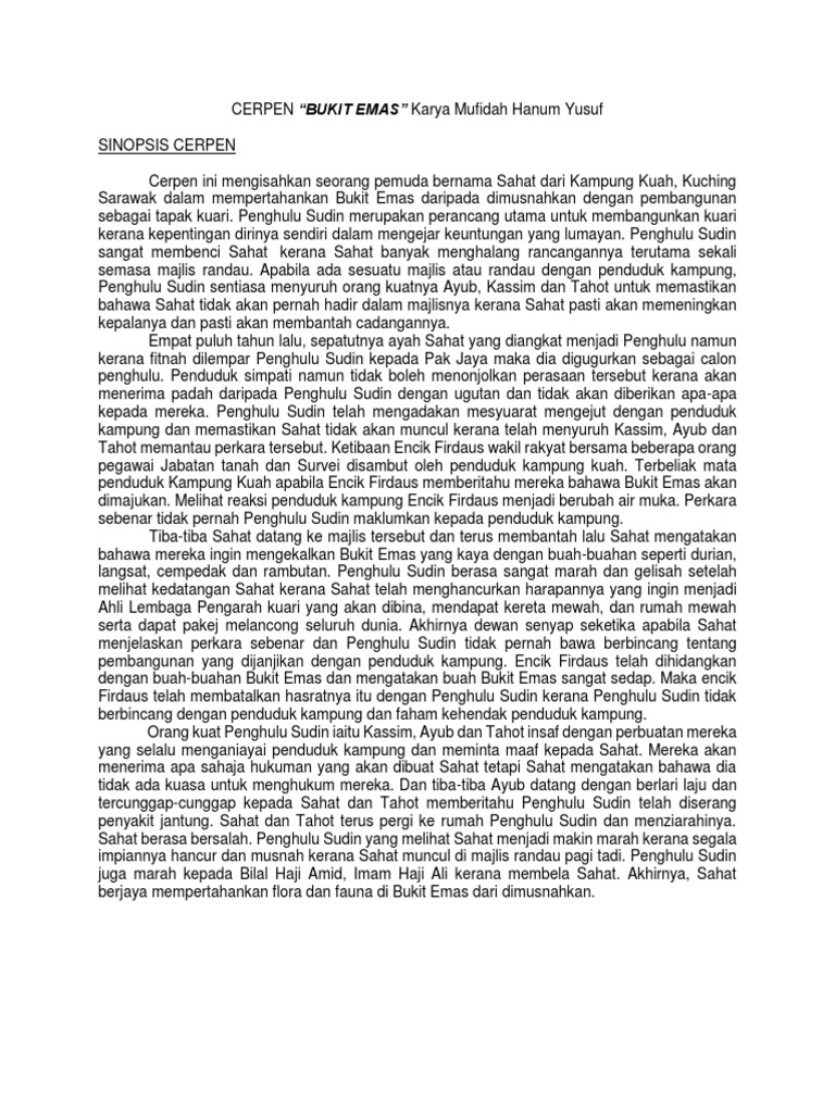 Penghulu Sudin merupakan ketua kampung tersebut. Cerpen BUKIT EMAS oleh Mufidah Hanum Yusuf Sinopsis Cerpen ini mengisahkan tentang kehidupan rakyat di kampung Kuah Sarawak. Kerusi tempat Penghulu Sudin melabuhkan punggungnya terasa semakin panas.